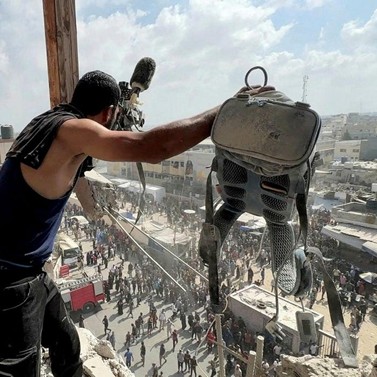 Ο εξοπλισμός που χρησιμοποίησε ο Παλαιστίνιος εικονολήπτης Χουσάμ αλ-Μάσρι στο σημείο όπου σκοτώθηκε μαζί με άλλους δημοσιογράφους σε ισραηλινές επιδρομές στο νοσοκομείο Νάσερ του Χαν Γιουνίς, στη νότια Γάζα. Πηγή: Hatem Khaled/Reuters