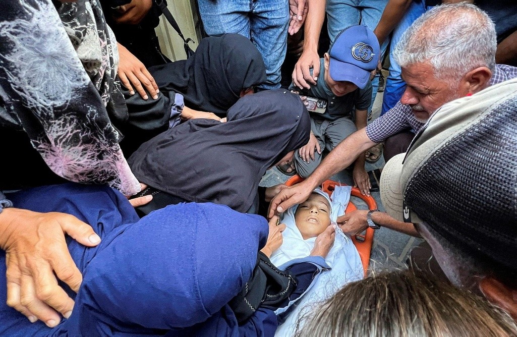Παλαιστίνιοι συγγενείς θρηνούν πάνω από τη σορό του 13χρονου Καρίμ Κντέιχ, ο οποίος σκοτώθηκε μαζί με άλλους σε ισραηλινές επιδρομές κατά τη διάρκεια της νύχτας, κατά τη διάρκεια της κηδείας του έξω από το νοσοκομείο Νάσερ στο Χαν Γιουνίς το Σάββατο. Πίστωση: Mariam Dagga/AP