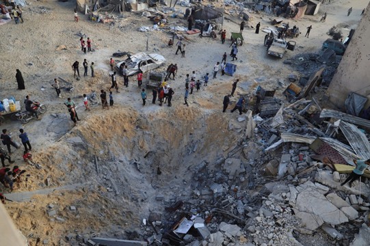 Παλαιστίνιοι επιθεωρούν το σημείο που επλήγη από ισραηλινό βομβαρδισμό στο Μουβάσι, Χαν Γιουνίς, Λωρίδα της Γάζας, 28 Ιουλίου 2025 Πίστωση: Mariam Dagga/AP