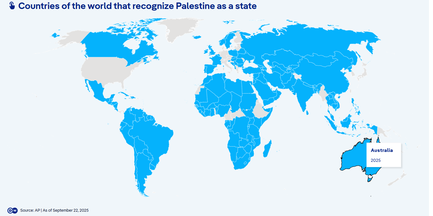 Η δραματική κατάσταση στη Γάζα έχει δώσει ώθηση στις προσπάθειες αναγνώρισης ενός ανεξάρτητου παλαιστινιακού κράτους. Περίπου 140 χώρες παγκοσμίως το είχαν ήδη αναγνωρίσει πριν από τις 7 Οκτωβρίου 2023. Δύο χρόνια μετά, 20 ακόμη χώρες έχουν επίσης αναγνωρίσει επισήμως την Παλαιστίνη — μεταξύ αυτών η Γαλλία, το Ηνωμένο Βασίλειο, η Ισπανία, η Αυστραλία και ο Καναδάς.