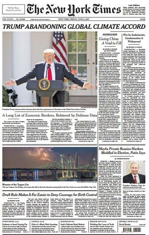 «Ενα ισχυρό χτύπημα» για την μάχη κατά της υπερθέρμανσης του πλανήτη αποκαλούν την απόφαση Τραμπ οι New-York Times, και απαριθμεί όλες τις επιχειρήσεις που ήταν αντίθετες με το Σύμφωνο του Παρισιού για το Κλίμα. Η εφημερίδα προσθέτει ότι πρόκειται για νίκη των εχθρών του κλίματος.