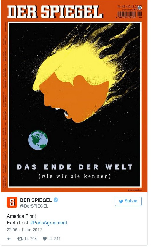 Στη Γερμανία, ο Spiegel εμφάνισε τον Ντόναλντ Τραμπ σαν έναν τρελό μετεωρίτη ο οποίος πέφτει με τρελή ταχύτητα στον πλανήτη Γη.