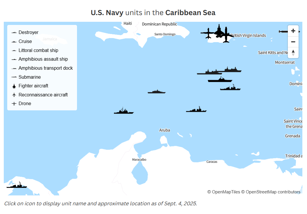 Αμερικανοί αξιωματούχοι δήλωσαν τον περασμένο μήνα ότι η Ουάσιγκτον αναπτύσσει τρία αντιτορπιλικά εξοπλισμένα με προηγμένους πυραύλους και χιλιάδες στελέχη στα νερά κοντά στη Βενεζουέλα, ως μέρος μιας εκστρατείας κατά των λατινοαμερικάνικων καρτέλ ναρκωτικών και συμμοριών.