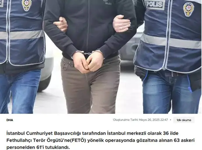 Σε επιχείρηση κατά της Φετουλάχιστανικής Τρομοκρατικής Οργάνωσης (FETÖ) σε 36 επαρχίες με κέντρο την Κωνσταντινούπολη, συνελήφθησαν 61 εν ενεργεία στρατιωτικοί, συμπεριλαμβανομένων αντισυνταγματαρχών, ταγματαρχών και λοχαγών, γράφουν σήμερα τα τουρκικά ΜΜΕ.