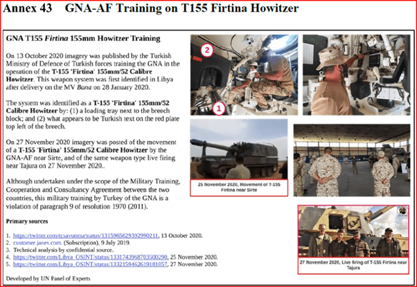 Πάνω: αυτοκινούμενο πυροβόλο τουρκικής κατασκευής Τ-155 Firtina (παρατηρείστε την παραλλαγή του πυροβόλου στα χρώματα ερήμου που σημαίνει ότι μεταφέρθηκε στη Λιβύη από τα κατεχόμενα εδάφη της Κύπρου. Συγκεκριμένα με το πλοίο MV Bana το οποίο απέπλευσε από το λιμάνι της Μερσίνας στις 28 Ιαν 2020)