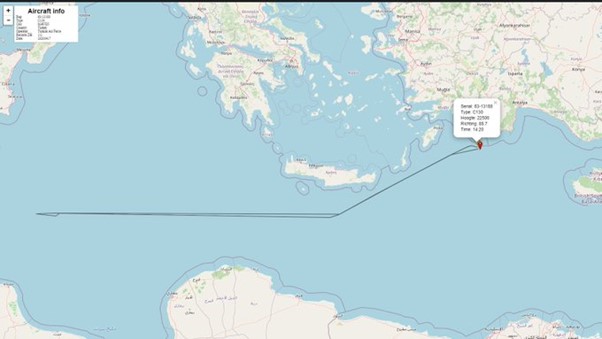 Πάνω: το ίχνος πτήσεως των μεταγωγικών και F-16 συνοδείας ποπυ έλαβαν μέρος στην “Άσκηση Ανοικτών θαλασσών” μια άσκηση που αποσκοπούσε στη χρονομέτρηση αεροπορικών επιχειρήσεων άνωθεν Λιβύης. Το FIR Αθηνών περνιέται σουβλάκι.