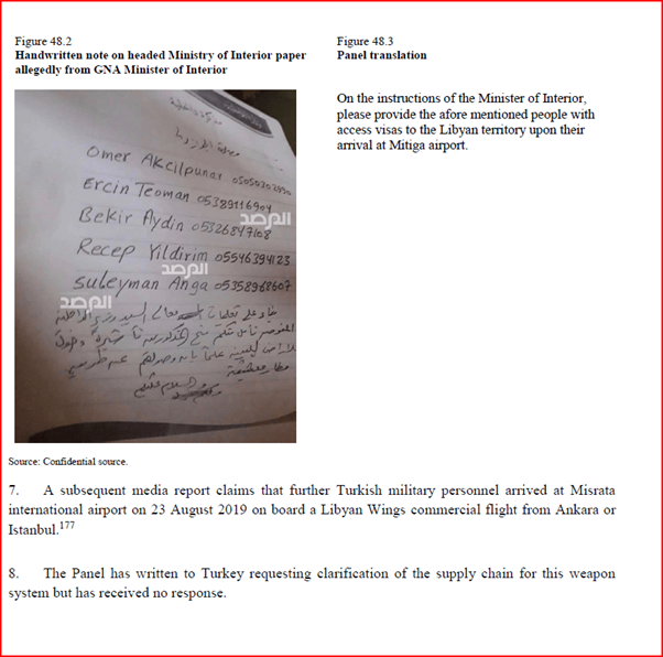 Πάνω: χειρόγραφη λίστα με τα ονόματα και τα κινητά μισθοφόρων που μεταφέρθηκαν στη Λιβύη (Πηγή: United Nations)