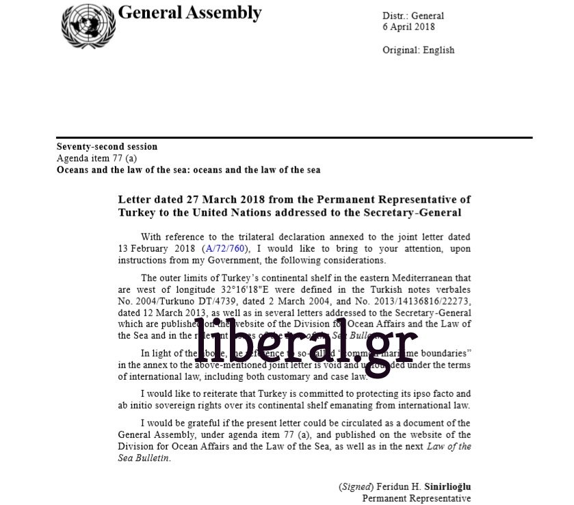Η Τουρκική επιστολή που δημοσιεύθηκε ως επίσημο έγγραφο της Γενικής Συνέλευση (Α/72/820 6 Απριλίου 2018) αναφέρει μεταξύ άλλων τα εξής: