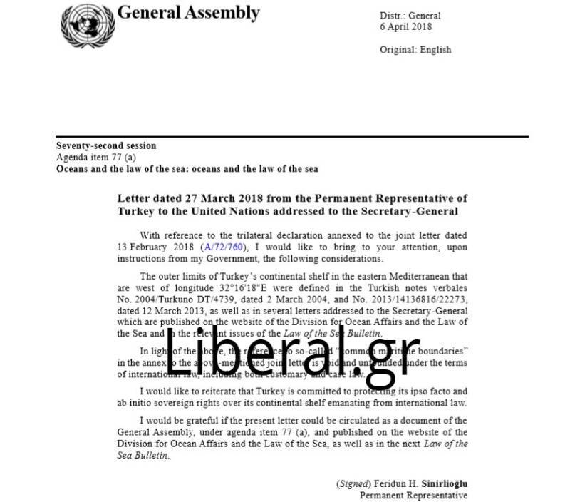 Η τουρκική επιστολή που δημοσιεύθηκε ως επίσημο έγγραφο της Γενικής Συνέλευση (Α/72/820 6 Απριλίου 2018) αναφέρει μεταξύ άλλων τα εξής: