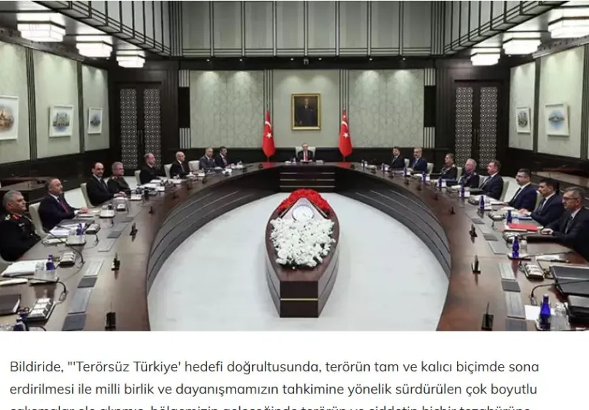 Η ανακοίνωση του Συμβουλίου Εθνικής Ασφαλείας της Τουρκίας, τόνισε ότι δεν υπάρχει περιθώριο για καμία εκδήλωση τρομοκρατίας και βίας στο μέλλον της περιοχής, δηλώνοντας ότι συζητήθηκαν οι πολυδιάστατες προσπάθειες που αποσκοπούν στον πλήρη και οριστικό τερματισμό της τρομοκρατίας και στην ενίσχυση της εθνικής ενότητας και αλληλεγγύης, σύμφωνα με τον στόχο μιας «Τουρκίας Χωρίς Τρομοκρατία», γράφουν τα τουρκικά μέσα ενημέρωσης.