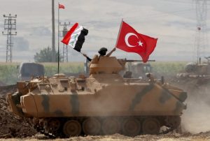 Soldiers hold a Turkish (R) and Iraqi (L) national flag while standing in the turret of a Turkish armored vehicle participating in a military exercise near the Turkish-Iraqi border in the Silopi district, in Sirnak City, Turkey, 26 September 2017. EPA, SEDAT SUNA
