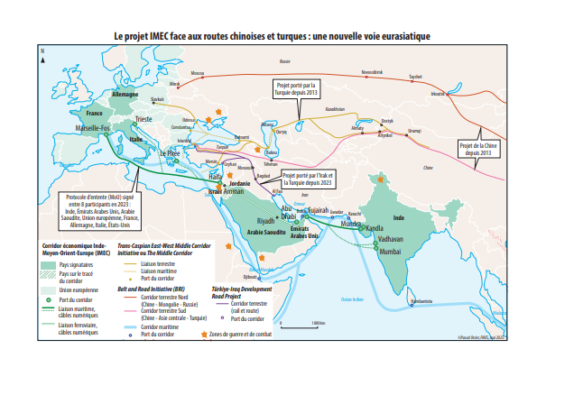 Ο Οικονομικός Διάδρομος Ινδίας–Μέσης Ανατολής–Ευρώπης (IMEC), ο οποίος ανακοινώθηκε επίσημα τον Σεπτέμβριο του 2023 στο περιθώριο της Συνόδου G20 στο Νέο Δελχί, αποτελεί ένα σχέδιο δημιουργίας λογιστικού και οικονομικού διαδρόμου που θα συνδέει την Ασία με την Ευρώπη μέσω της Μέσης Ανατολής. Ένα μνημόνιο κατανόησης υπεγράφη από την Ινδία, τα Ηνωμένα Αραβικά Εμιράτα, τη Σαουδική Αραβία, την Ευρωπαϊκή Ένωση, τη Γαλλία, τη Γερμανία, την Ιταλία και τις Ηνωμένες Πολιτείες, με στόχο την ενίσχυση της διακίνησης εμπορικών αγαθών, της μεταφοράς ενέργειας και της ψηφιακής συνδεσιμότητας μέσω ενός συνόλου σιδηροδρομικών και θαλάσσιων οδών, καλωδίων και αγωγών.