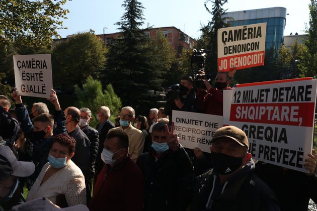 «Η πλακέτα εγκαινιάζεται στη μνήμη των 2.900 θυμάτων των Αλβανών της Τσαμουριάς από τον Έλληνα γενοκτόνο…Χιλιάδες Αλβανοί πολίτες, μεταξύ των οποίων από το Κοσσυφοπέδιο και τη Βόρεια Μακεδονία, συμμετείχαν στην εκδήλωση που διοργανώθηκε από το Κόμμα Δικαιοσύνης, Ένταξης και Ενότητας, την ένωση “Chameria” και το Ίδρυμα Çam ërria – Χασάν Ταχσίνι, για τον εορτασμό της 77ης επετείου από την γενοκτονία που διέπραξαν οι Έλληνες εναντίον των Τσάμηδων … Αυτό το μνημειακό νεκροταφείο περιμένει 2.900 άνδρες, γυναίκες, παιδιά και ηλικιωμένους, οι οποίοι αφού εκδιώχθηκαν από τη γη τους στην Τσαμουριά, από τις συμμορίες του Ναπολέοντα Ζέρβα, έχασαν με τραγικό τρόπο τη ζωή τους από τη δίψα, την πείνα και τις ασθένειες κατά τη διάρκεια της πορείας τους προς την Αλβανία.»