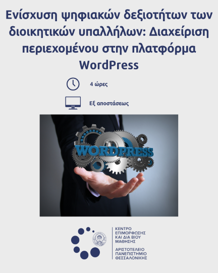 «Ενίσχυση ψηφιακών δεξιοτήτων των διοικητικών υπαλλήλων: Διαχείριση περιεχομένου στην πλατφόρμα WordPress» διάρκειας 4 ωρών (2 δίωρα) , το οποίο θα διεξαχθεί την Τρίτη 3 Μαρτίου και Πέμπτη 5 Μαρτίου 12:00 μ.μ.-14:00 μ.μ.