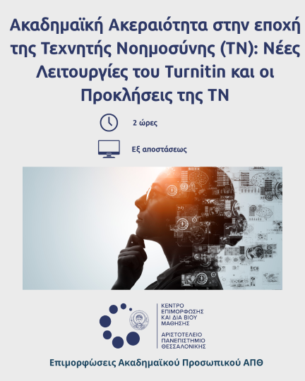 «Ακαδημαϊκή Ακεραιότητα στην εποχή της Τεχνητής Νοημοσύνης (ΤΝ): Νέες Λειτουργίες του Turnitin και οι Προκλήσεις της ΤΝ», διάρκειας 2 ωρών , το οποίο θα διεξαχθεί την Τρίτη, 10 Μαρτίου 2026, 12.00 μ.μ. – 14.00 μ.μ.