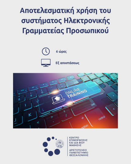 «Αποτελεσματική χρήση του συστήματος Ηλεκτρονικής Γραμματείας Προσωπικού», διάρκειας 2 ωρών, το οποίο θα διεξαχθεί την Τρίτη 24 Φεβρουαρίου- Τετάρτη 25 Φεβρουαρίου και Πέμπτη 26 Φεβρουαρίου 2026 (12:00-14:00)