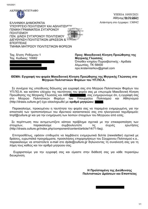 Διαβάστε προσεκτικά το παραπάνω κείμενο. Η ελληνική πολιτεία αναγνωρίζει την διδασκαλία Μακεδονικής Γλώσσας και καταχωρεί στο Μητρώο Πολιτιστικών Φορέων του υπουργείου πολιτισμού την σχετική αίτηση.