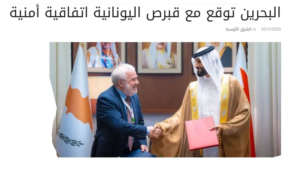 Το Μπαχρέιν και η Κυπριακή Δημοκρατία υπέγραψαν συμφωνία ασφαλείας, την οποία και τα δύο μέρη χαρακτήρισαν ως «ιστορική συμφωνία», γράφει αραβικό δημοσίευμα.