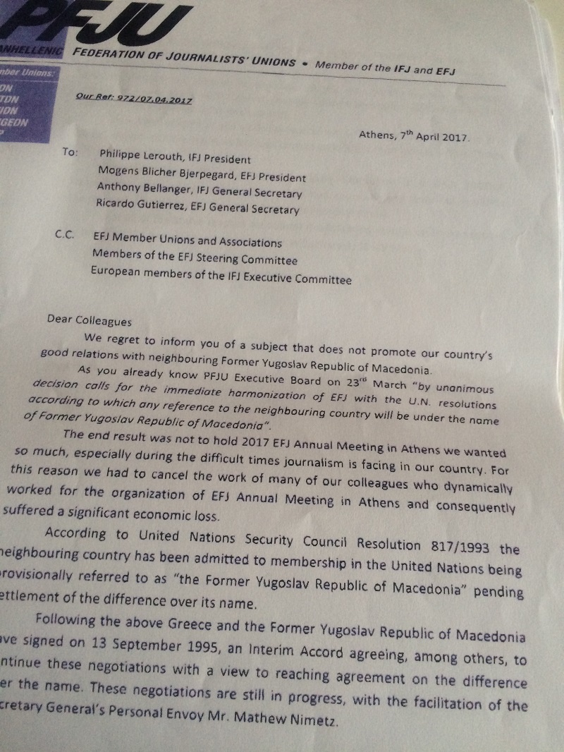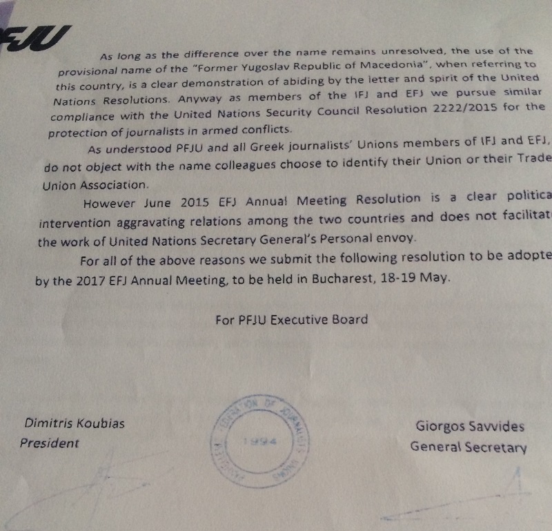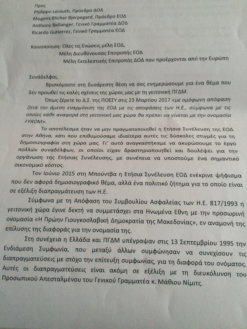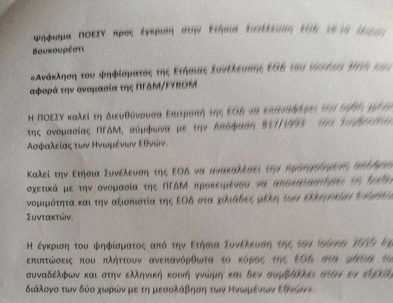 Έκπληκτος ο δημοσιογραφικός κόσμος, η ΕΣΗΕΑ και η ΠΟΕΣΥ διαπίστωσαν ότι στη Συνέλευση της ΕΟΔ στο Μαυροβούνιο τον Ιούνιο του 2015 είχε υιοθετηθεί ψήφισμα, με το οποίο η ΕΟΔ αναγνωρίζει τα Σκόπια ως «Μακεδονία».