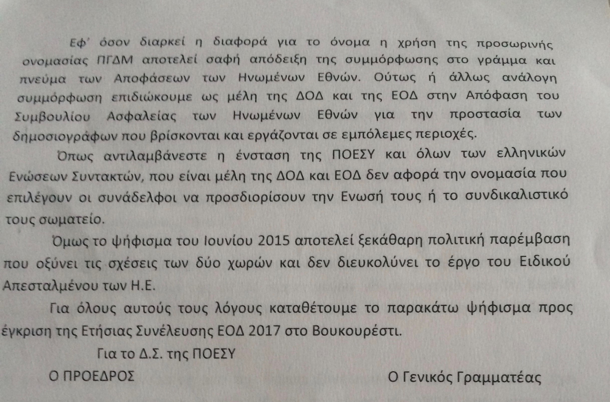 - Τι ενέργειες έκαναν η ηγεσία της ΠΟΕΣΥ όταν αποκαλύφθηκε η συντονισμένη (;) περίεργη απόκρυψη σε βαθμό παραπλάνησης εκ μερους συγκεκριμενων μελων του ΔΣ για ψήφισμα τον Ιούνιο του 2015 , οπότε η ΕΟΔ πήρε την απόφαση αναγνώρισης των Σκοπίων ως «Μακεδονία»; Ζητήθηκαν εξηγήσεις; Καταγγέλθηκαν; Άραγε, το ελληνικό υπουργείο Εξωτερικών, η Γενική Γραμματεία Ενημέρωσης και το Μέγαρο Μαξίμου, είναι ενήμεροι γι’ αυτές τις ενέργειες ορισμένων συνδικαλιστών; Κι αν ναι, τι έχουν κάνει;