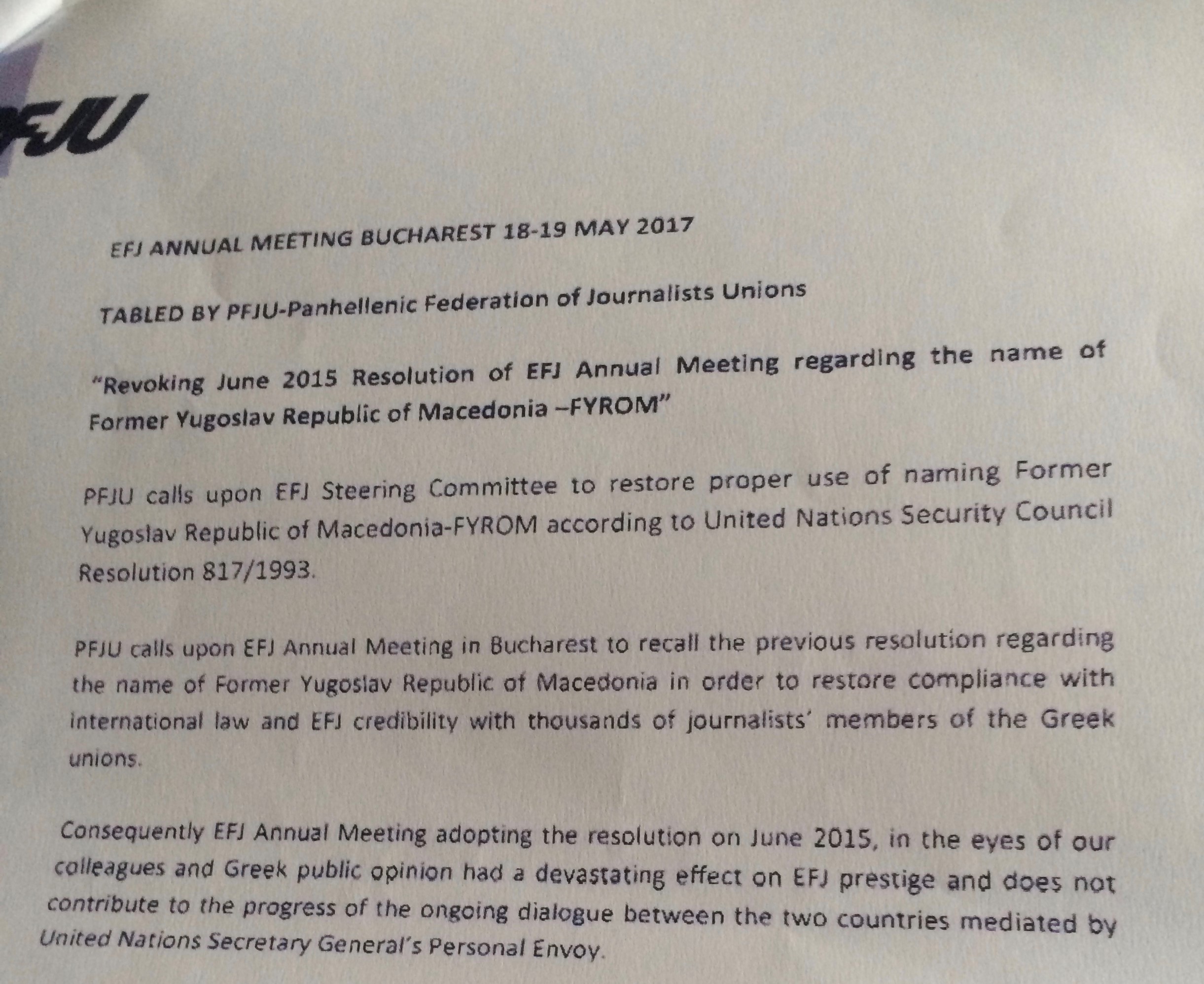 Σε πρόσφατη συνεδρίαση της ΠΟΕΣΥ ζητήθηκε από τον Πρόεδρο η ανάκληση του ψηφίσματος! Έκπληκτο το Συμβούλιο έμαθε ότι το προεδρείο της ΕΣΗΕΑ είχε αποφασίσει να μην παραστεί στο Βουκουρέστι να υπερασπιστεί το ψήφισμα για τη Μακεδονία μας.