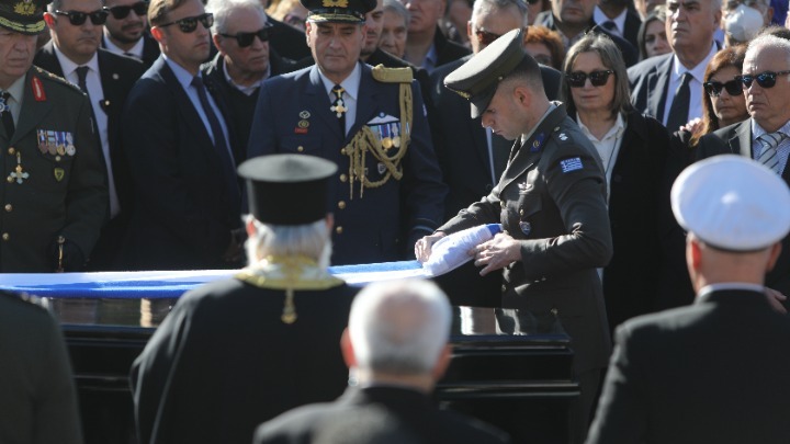 Νωρίτερα κατά την εξόδιο ακολουθία, στην οποία χοροστάτησε ο Αρχιεπίσκοπος Αθηνών και πάσης Ελλάδος Ιερώνυμος, εκφωνήθηκαν οι επικήδειοι της Προέδρου της Δημοκρατίας Κατερίνας Σακελλαροπούλου, του πρωθυπουργού Κυριάκου Μητσοτάκη, του προέδρου του ΠΑΣΟΚ Νίκου Ανδρουλάκη, και των καθηγητών Τάσου Γιαννίτση (πρώην υπουργός), Γιάννη Βούλγαρη, και Κωνσταντίνου Τσουκαλά.