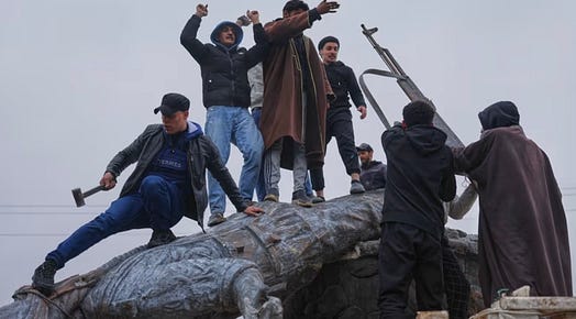 Το άγαλμα μιας Κούρδισσας μαχήτριας, μετά την κατάληψη της Ταμπκά, ανατρέπεται από τοπική πολιτοφυλακή — Κυριακή, 18 Ιανουαρίου 2026. (AP/Ghaith Alsayed)