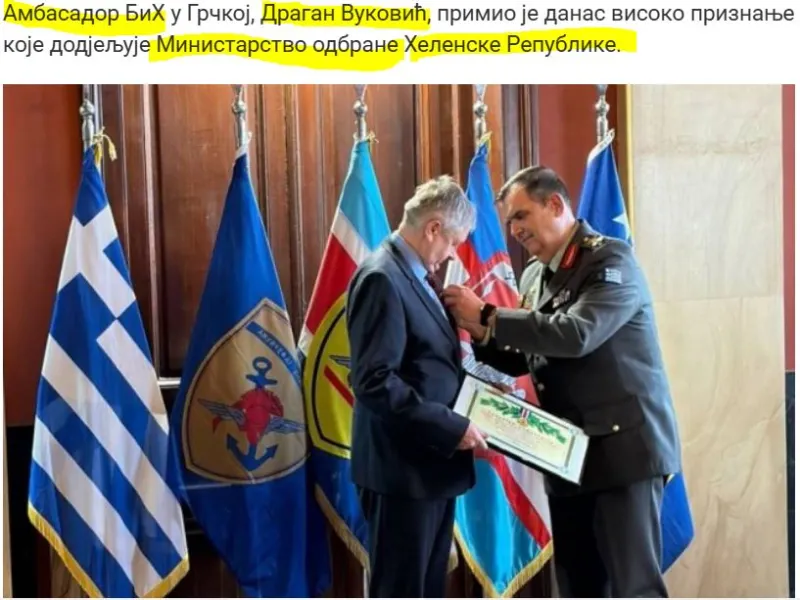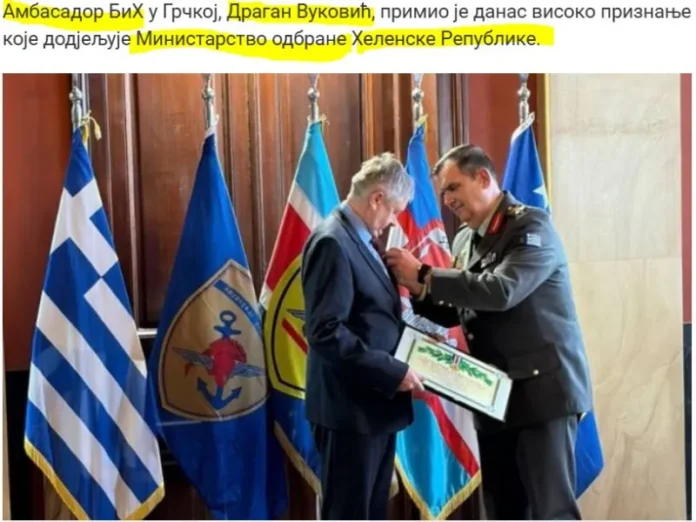 Ο Πρέσβης της Βοσνίας-Ερζεγοβίνης στην Ελλάδα, Ντράγκαν Βούκοβιτς, έλαβε σήμερα μια υψηλή αναγνώριση που του απονεμήθηκε από το Υπουργείο Άμυνας της Ελληνικής Δημοκρατίας, γράφουν σήμερα τα σερβικά μέσα ενημέρωσης.
