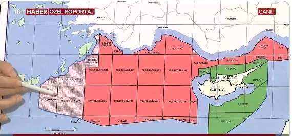 Το ψευδοκράτος έχει δώσει άδειες για έρευνες στην τουρκική κρατική εταιρεία πετρελαίου ΤΡΑΟ. Στο χάρτη φαίνονται με πράσινο χρώμα οι περιοχές που μας έδειχνε ο Υπουργός Ενέργειας Ντονμέζ τον Ιούνιο του 2020.