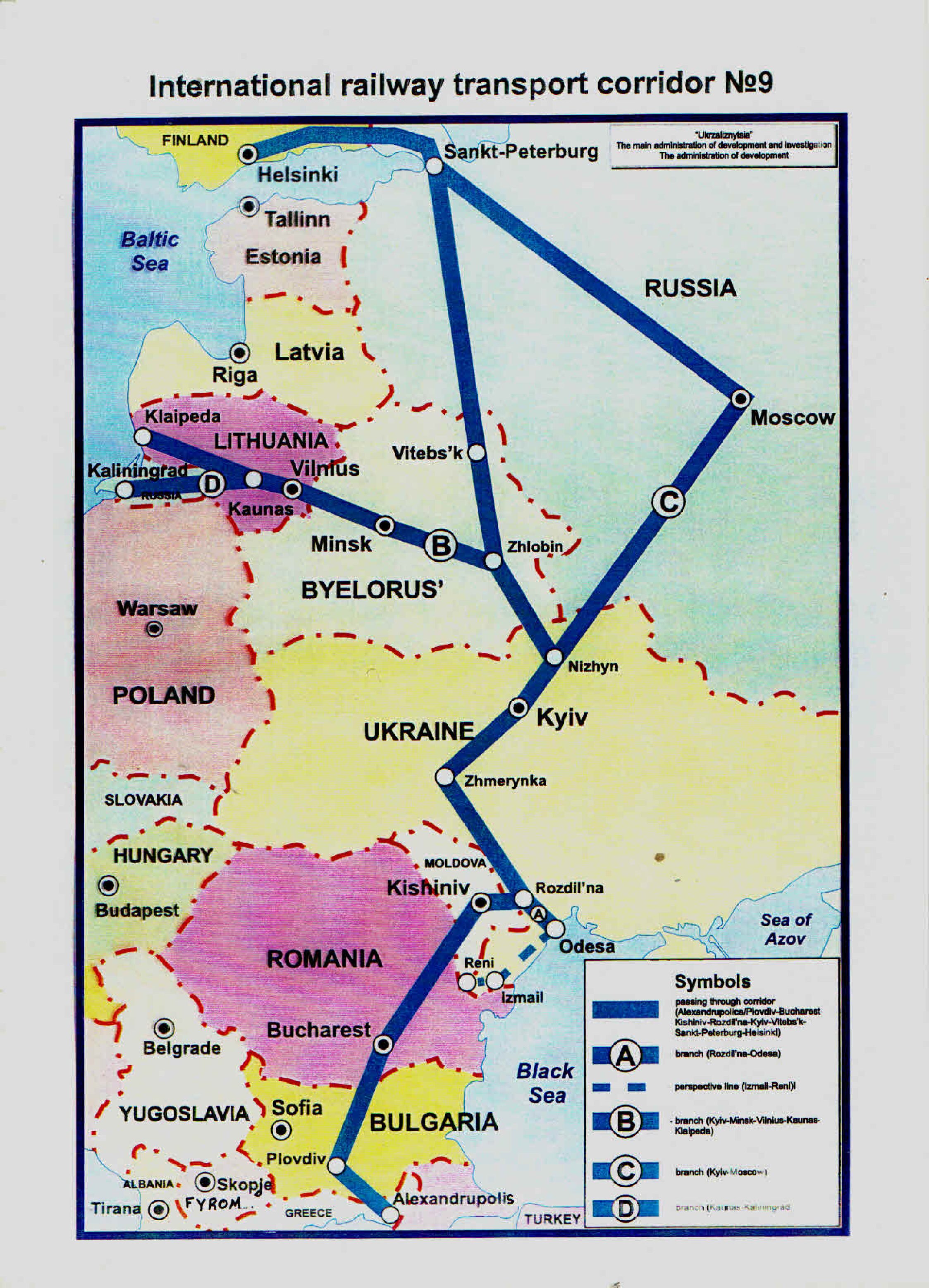 Γιαυτό η ΕΕ το 1992, αξιοποιώντας τις δυνατότητες που δημιούργησαν τα δύο κοσμοϊστορικά γεγονότα, δημιούργησε τον Διευρωπαϊκό σιδηροδρομικό Διάδρομο ΙΧ (ΔΔ ΙΧ) που θα συνέδεε τη Βαλτική (Ελσίνκι) με τη Μεσόγειο (Αλεξανδρούπολη). Δεν συνέδεε μόνον την Αλεξανδρούπολη με το Ελσίνκι αφήνοντας έξω την Ουκρανία, όπως ισχυρίζεται ο αρθρογράφος,. Αντίθετα ο ΔΔ ΙΧ διασχίζει την Ουκρανία, όπως φαίνεται στο συνημμένο διάγραμμα, διέρχεται από το Κίεβο και διακλαδίζεται στην Οδησσό αλλά και στο λιμάνι του Ισμαήλ. Διέρχεται από το Βουκουρέστι, το Κισινάου, την Αγία Πετρούπολη και διακλαδίζεται και προς το Μινσκ, το Βίλνιους, το Καλίνινγκραντ, όπως και προς τη Μόσχα.