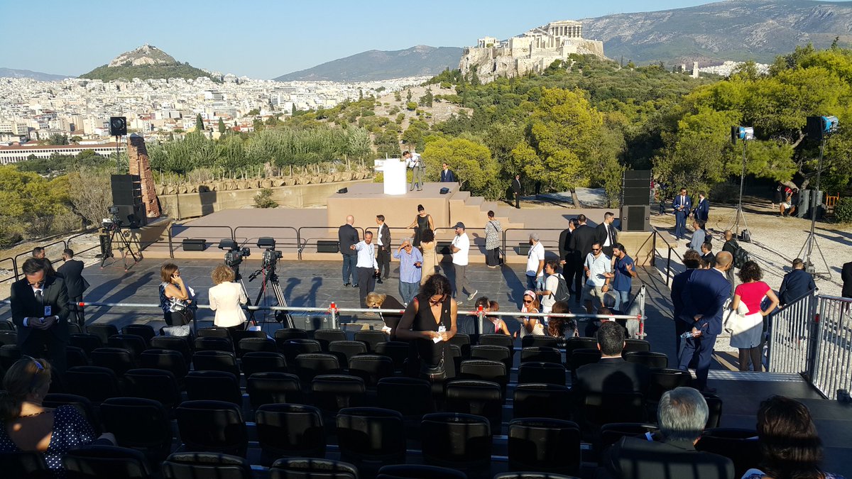 Δείτε φωτογραφίες από τις ετοιμασίες στον χώρο της Πνύκας πριν αρχίσουν οι ομιλίες Μακρόν-Τσίπρα: