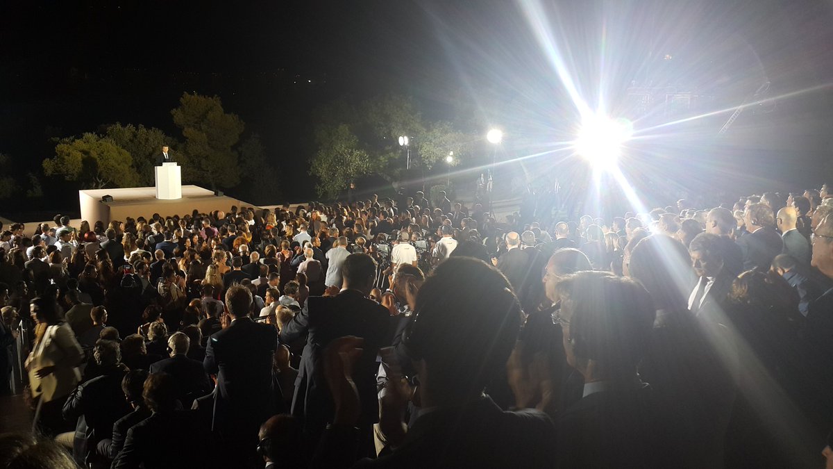 «Σε αυτό το μέρος οι Αθηναίοι επινόησαν την Δημοκρατία. Το γεγονός ότι παίρνω τον λόγο εδώ στο ίδιο μέρος ενώπιον σας, το ξέρω, είναι ένα πολύ μεγάλο προνόμιο,. Γι’ αυτό ευχαριστώ θερμά την κυβέρνηση και τις Αρχές αλλά ιδιαίτερα τον πρωθυπουργό Αλέξη Τσίπρα που με κάλεσε να μιλήσω από εδώ!» είπε σε άψογα ελληνικά ο γάλλος πρόεδρος και καταχειροκροτήθηκε από τους παρευρισκομένους.