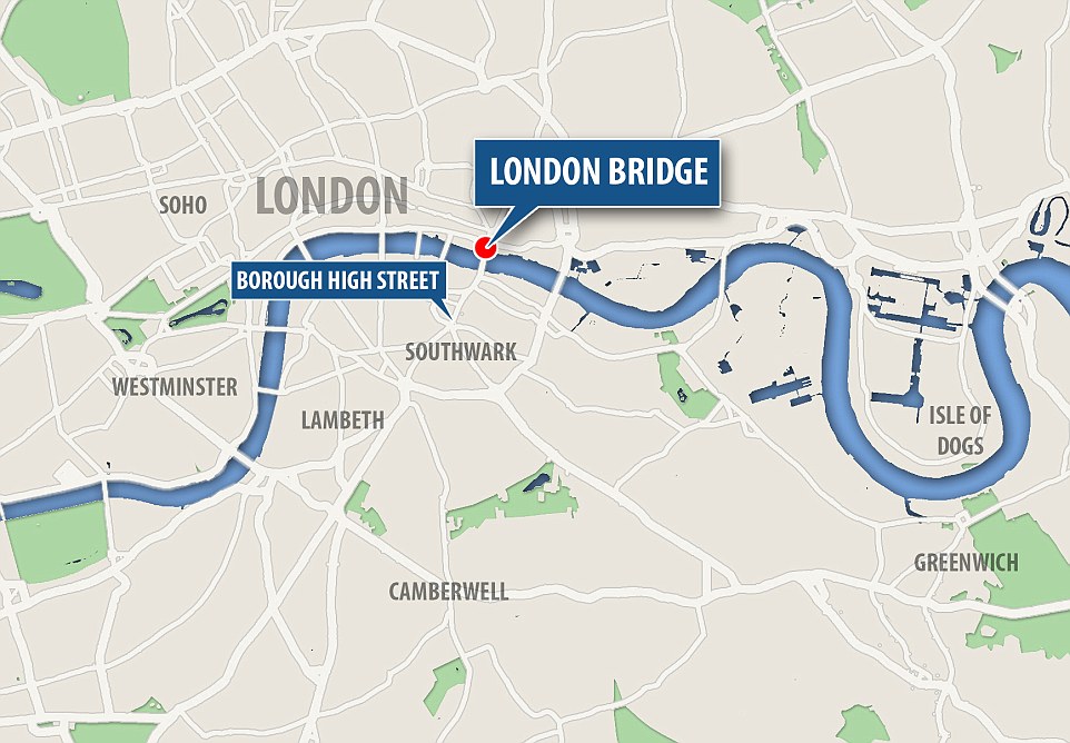 Νωρίτερα σύμφωνα με τη Daily Mail, άνδρες, «μεσογειακής καταγωγής» που φώναζαν «αυτό είναι για τον Αλλάχ», αφού έριξαν το βαν σε 15-20 πεζούς σκοτώνοντας επτά ανθρώπους, άρχισαν να μαχαιρώνουν όσους πολίτες έβλεπαν μπροστά τους. Στη συνέχεια κινήθηκαν προς την αγορά Μπόροου και με μεγάλα κυνηγητικά μαχαίρια και χτυπούσαν όποιον έβρισκαν μπροστά τους. Το CNN μετέδωσε πως δύο άνδρες μπήκαν σε ένα εστιατόριο στην περιοχή Borough Market, κοντά στη γέφυρα του Λονδίνου, και μαχαίρωσαν δύο ανθρώπους που βρίσκονταν στο εσωτερικό του.