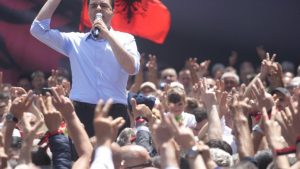 File Photo: Lulzim Basha, leader of Albanian opposition Democratic Party addresses protesters during an anti-government rally in front of the government building in Tirana, Albania. EPA, MALTON DIBRA JUNE 11, 2017