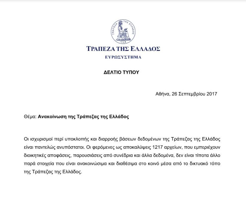 Οι ισχυρισμοί περί υποκλοπής και διαρροής βάσεων δεδομένων της Τράπεζας της Ελλάδος είναι παντελώς ανυπόστατοι. Οι φερόμενες ως αποκαλύψεις 1217 αρχείων, που εμπεριέχουν διοικητικές αποφάσεις, παρουσιάσεις από συνέδρια και άλλα δεδομένα, δεν είναι τίποτα άλλο παρά στοιχεία που είναι ανακοινώσιμα και διαθέσιμα στο κοινό μέσα από το δικτυακό τόπο της Τράπεζας της Ελλάδος.