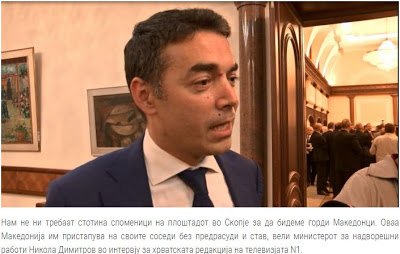 «Δεν χρειαζόμαστε εκατοντάδες μνημεία στην πλατεία των Σκοπίων για να είμαστε υπερήφανοι ως (Σλαβο) – «Μακεδόνες». Αυτά ερεθίζουν τους γείτονές μας και είναι επιφυλακτικοί στις θέσεις τους, δήλωσε ο υπουργός Εξωτερικών Νίκολα Ντιμιτρόφ, σε συνέντευξή του στην κροατική τηλεόραση «N1».