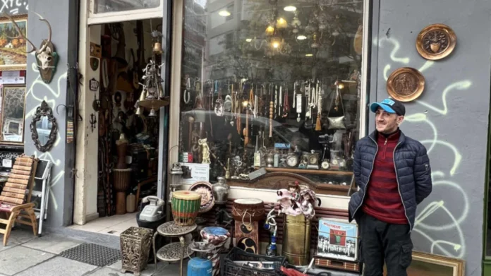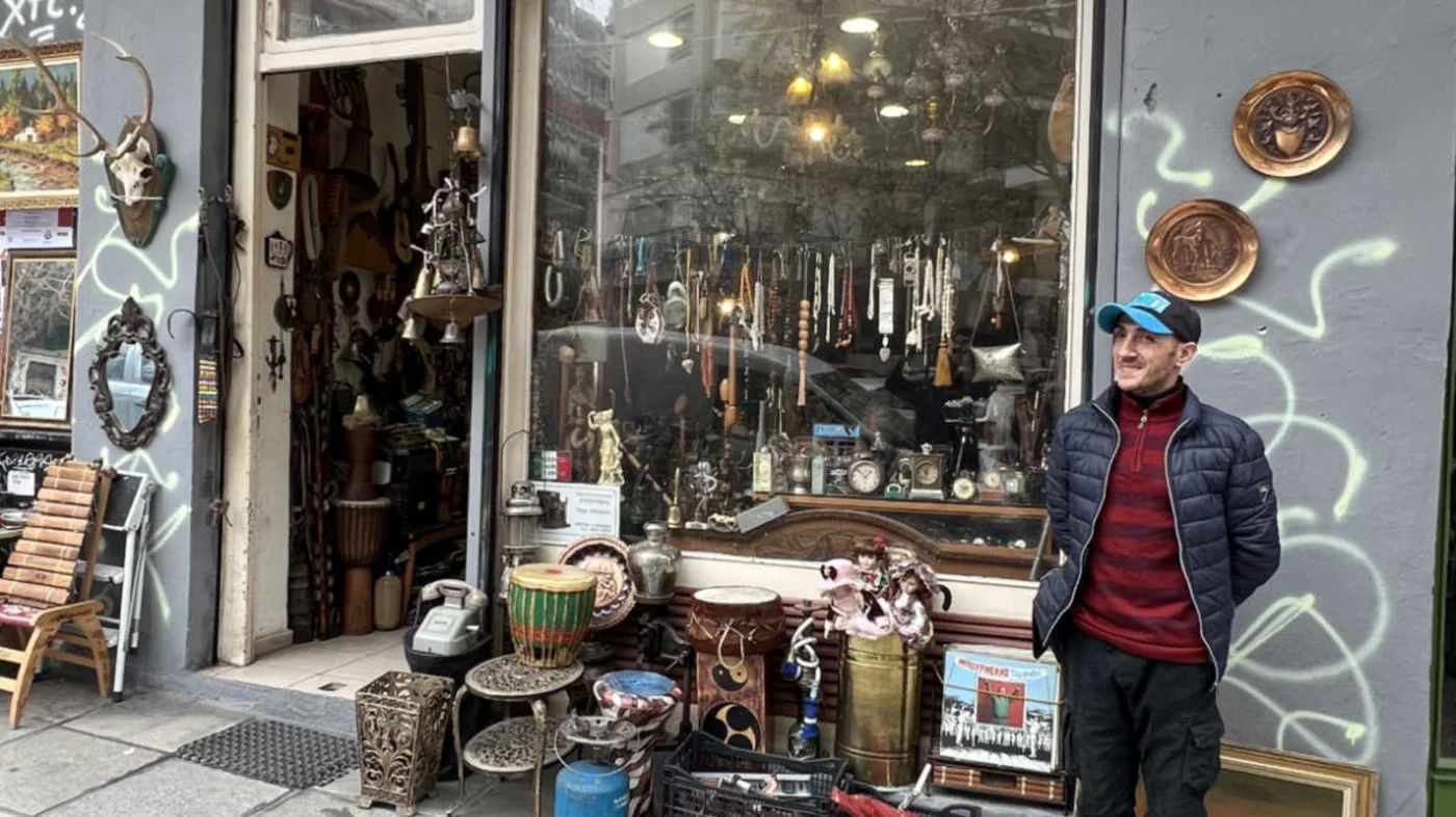 Ο καταστηματάρχης Χρήστος στέκεται έξω από ένα αντικερί στο Μπιτ Παζάρ της Θεσσαλονίκης, 10 Φεβρουαρίου 2024 (Sean Mathews/MEE)