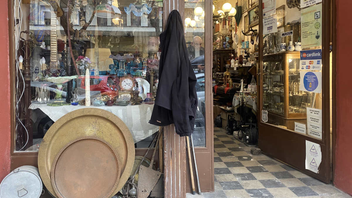 Κεχριμπαρένιες χάντρες κρέμονται από τις βιτρίνες. Τα μάτια μου πηδούν από σταυρούς και μενορά σε μία ζυγαριά σημειωμένη με οκκάδες, τη μονάδα βάρους της Οθωμανικής Αυτοκρατορίας. Αποφεύγω μια σειρά από σεντόνια, αποσπώμενος από το μουστακαλίδικο πρόσωπο ενός τραγουδιστή του ρεμπέτικου – ερμηνευτή τραγουδιών για χασίς και καραβάνια με καμήλες – σε έναν παλιό δίσκο βινυλίου.