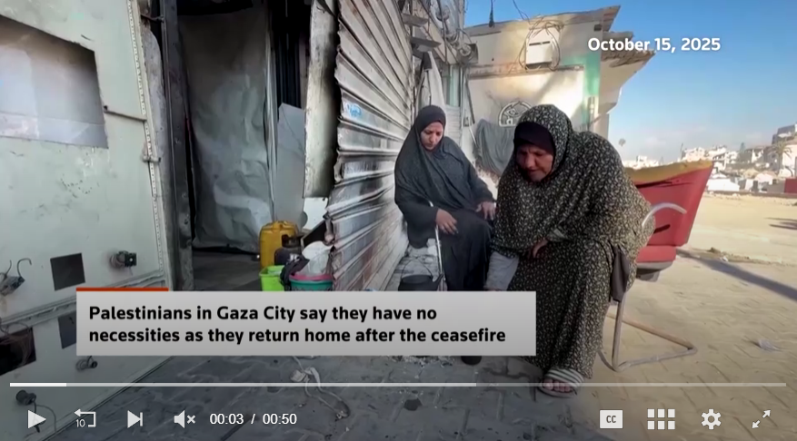 «Η κατάστασή μας είναι απολύτως τραγική. Επιστρέψαμε στα σπίτια μας στη συνοικία αλ-Τουφάχ και διαπιστώσαμε ότι δεν υπάρχουν καθόλου σπίτια. Δεν υπάρχει καταφύγιο. Τίποτα», δήλωσε ο Μούμεν Χασανέιν στην Πόλη της Γάζας, με τέντες και πρόχειρες κατασκευές πίσω του.