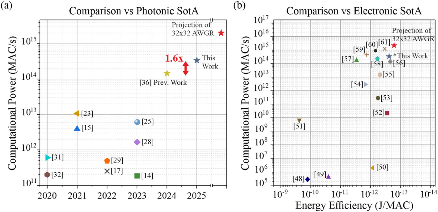 Ο προτεινόμενος πολυδιάστατος επιδείκτης (demonstrator) πολλαπλασιασμού τανυστών, βασισμένος σε AWGR, αποτελείτο από ένα AWGR 16 × 16, μια πηγή λέιζερ τύπου frequency comb που παρείχε τα 16 μήκη κύματος–φορείς, καθώς και υψηλής ταχύτητας MZMs. Με την οδήγηση των διαμορφωτών βαρών και σήματος εισόδου στα 20 Gbaud, η συνολική υπολογιστική ισχύς φτάνει τα 163.84 TOPS, τιμή που αυξάνεται στο 262 TOPS όταν ο ρυθμός συμβόλων αυξηθεί στα 32 Gbaud — επίδοση-ρεκόρ. Αυτό αντιστοιχεί σε ~60% αύξηση της υπολογιστικής ισχύος σε σύγκριση με την προηγούμενη εργασία μας³⁶ ή σε ~2200% αύξηση σε σύγκριση με την επόμενη υψηλότερη δημοσιευμένη επίδοση σε TOPS, δηλαδή την αρχιτεκτονική PNN της Αναφ. 23.