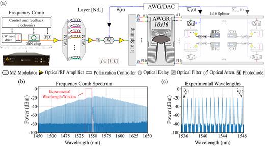 Αποτελείται από έναν AWGR 16 × 16, ο οποίος αξιοποιεί τη διαίρεση χρόνου, μήκους κύματος και χώρου (T-W-SDM) για την κωδικοποίηση βαρών και εισόδων, σε συνδυασμό με ενσωματωμένη χτένα συχνοτήτων (frequency comb) από Si₃N₄ για πολυκαναλική παραγωγή μηκών κύματος.