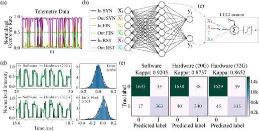 Η πρώτη εφαρμογή ήταν η αναγνώριση επιθέσεων DDoS με χρήση ενός πλήρως συνδεδεμένου NN (FCNN), όπου ο επιταχυντής πέτυχε πειραματική βαθμολογία Cohen’s κ = 0.8652 για 2048 δείγματα inference—απόδοση πολύ κοντά στη λειτουργία λογισμικού.
