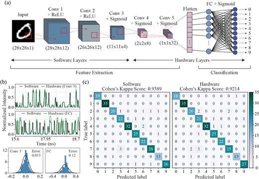 Για την αξιολόγηση της επίδοσης του φωτονικού επιταχυντή τεχνητής νοημοσύνης και σε συνελικτικά νευρωνικά δίκτυα (CNNs), πραγματοποιήθηκε μια δεύτερη διαδικασία πειραματικής επικύρωσης για την ταξινόμηση χειρόγραφων ψηφίων μέσω ενός υβριδικού NN λογισμικού/υλικού. Πιο συγκεκριμένα, η τοπολογία του NN αποτελούνταν από πέντε συνελικτικές στρώσεις και μία πλήρως συνδεδεμένη στρώση για την τελική ταξινόμηση. Από αυτές τις στρώσεις, οι τρεις πρώτες συνελικτικές στρώσεις εκτελέστηκαν σε λογισμικό και ήταν υπεύθυνες για την αρχική μείωση διαστασιμότητας, ενώ οι δύο επόμενες συνελικτικές στρώσεις και η τελική πλήρως συνδεδεμένη στρώση υλοποιήθηκαν στο φωτονικό υλικό.