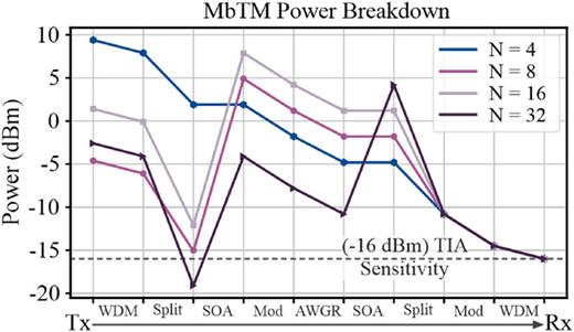 Το Σχήμα 6 παρουσιάζει την ανάλυση σκοπιμότητας ολοκλήρωσης του προτεινόμενου επιταχυντή MbTM, υποδεικνύοντας την ανάγκη για οπτική ενίσχυση σε N = 8, 16, 32: