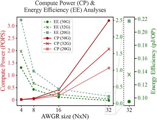 Το Σχήμα 7 παρουσιάζει τις προοπτικές κλιμάκωσης της αρχιτεκτονικής και απεικονίζει δύο βασικούς δείκτες των υπολογιστικών μηχανών, δηλαδή την υπολογιστική ισχύ (CP) και την ενεργειακή απόδοση (EE), σε σχέση με το μέγεθος του AWGR, λαμβάνοντας υπόψη ολοκληρωμένα φωτονικά στοιχεία τεχνολογίας αιχμής (συμπληρωματικό υλικό, S3).