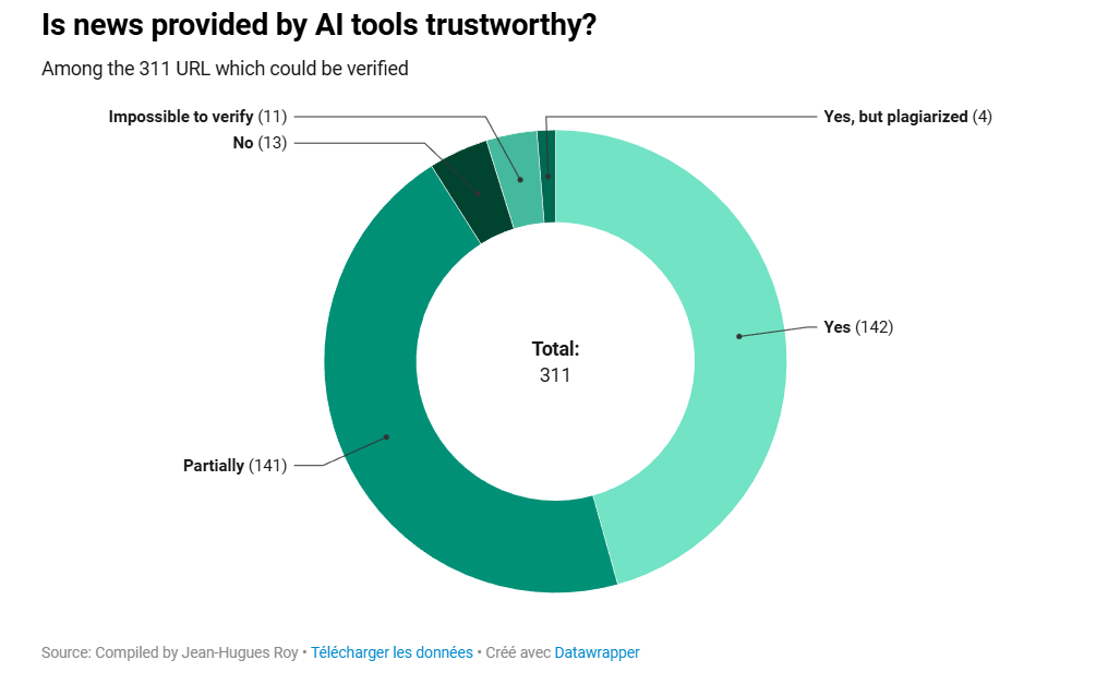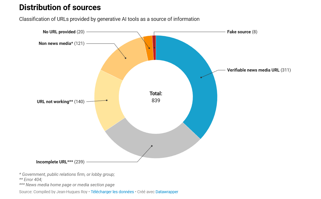 Ωστόσο, στο 18% των περιπτώσεων τα εργαλεία δεν κατάφεραν να παραπέμψουν σε ειδησεογραφικά μέσα, βασιζόμενα αντ’ αυτού σε κυβερνητικούς ιστότοπους, ομάδες πίεσης ή ακόμη και επινοώντας ανύπαρκτες πηγές, όπως το προαναφερθέν examplefictif.ca.