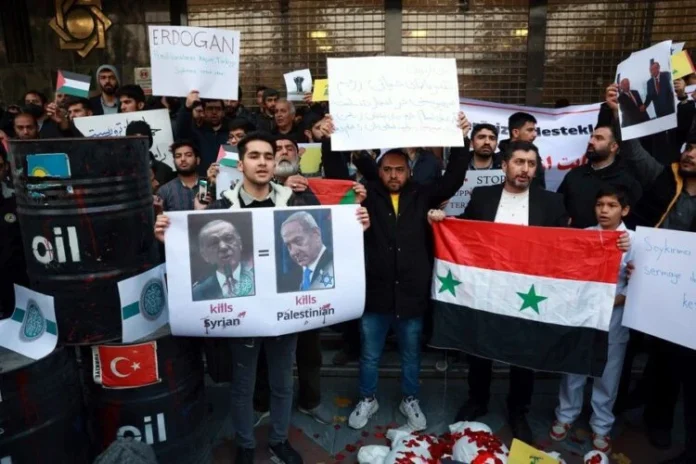 Διαδηλωτές στην Τεχεράνη κρατούν αφίσα με τις φωτογραφίες του Ερντογάν και του Νετανιάχου (φωτ. αρχείου: EPA/ABEDIN TAHERKENAREH)