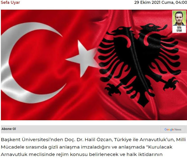 Ο αναπληρωτής καθηγητής στο πανεπιστήμιο Başkent, Χαλίλ Οζτζάν, ανέφερε ότι η Τουρκία και η Αλβανία υπέγραψαν μυστική συμφωνία κατά τη διάρκεια του τουρκικού εθνικού αγώνα και η συμφωνία περιελάμβανε και ένα άρθρο για το καθεστώς που θα είχε η Αλβανία:
