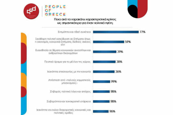 ΟΙ ΠΟΛΙΤΕΣ ἀναζητοῦν αὐτό πού διαπιστώνουν ὅτι λείπει. Ὅταν λοιπόν ζητοῦν ἀπό τίς πολιτικές ἡγεσίες τους ἐντιμότητα καί ἦθος, εἶναι προφανές ὅτι τήν ἔλλειψη αὐτῶν τῶν χαρακτηριστικῶν διαπιστώνουν ἀπό τήν κεντρική πολιτική σκηνή τῆς σήμερον. Πράγματι τό 77% τῶν Ἑλλήνων θεωροῦν τήν ἐντιμότητα καί τήν ἠθική συνέπεια ὡς τά σημαντικώτερα χαρακτηριστικά ἑνός πολιτικοῦ ἡγέτου. Αὐτό εἶναι τό συμπέρασμα ἐρεύνης τῆς ἑταιρείας People of Greece, ἡ ὁποία ὁλοκληρώθη προσφάτως καί ἡ ὁποία διαπιστώνει ἀκόμη ὅτι ἡ ἀποκάλυψις τοῦ σκανδάλου τῶν παρανόμων χρηματοδοτήσεων ἀπό τόν ΟΠΕΚΕΠΕ ἐκλαμβάνεται ὡς ἐπιβεβαίωσις τῆς ἐκτεταμένης διαφθορᾶς πού πλήττει τήν χώρα καί ὄχι ὡς ἔνδειξις ἀνατροπῆς τοῦ φαινομένου.