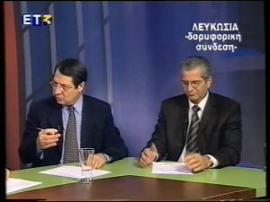 Ενόψει του δημοψηφίσματος που διεξήχθη στην Κύπρο για το Σχέδιο Ανάν, οι “Ανιχνεύσεις” της ΕΡΤ3, μετέδωσαν στις 23 Απριλίου 2004 την εκπομπή απο τη Λευκωσία. Το ενδιαφέρον της σημερινής ανάρτησης της εκπομπής είναι πως στο πάνελ παραβρέθηκε το σύνολο, σχεδόν, της κυπριακής ηγεσίας που, τότε, αλλά μερικοί και σήμερα, διαδραματίζουν τον κύριο ρόλο στις κυπριακές εξελίξεις.